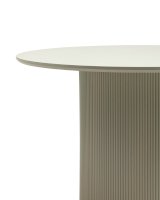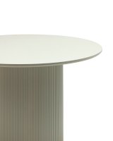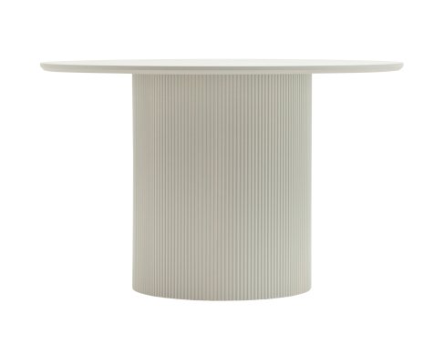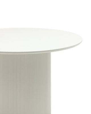 Столешница выполнена из прочного и долговечного МДФ. Светлая поверхность столешницы гармонично сочетается с массивной основой. Простая круглая форма стола позволит легко вписать его в современный интерьер, стол украсит кухню, гостиную или современное кафе, ресторан. Опорное плиссированное основание стола в лаконичном дизайне надёжно удерживает всю конструкцию и дополняют монолитный образ.