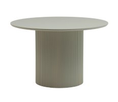 Столешница выполнена из прочного и долговечного МДФ. Светлая поверхность столешницы гармонично сочетается с массивной основой серого цвета. Простая круглая форма стола позволит легко вписать его в современный интерьер, стол украсит кухню, гостиную или современное кафе, ресторан. Опорное плиссированное основание стола в лаконичном дизайне надёжно удерживает всю конструкцию и дополняет монолитный образ.