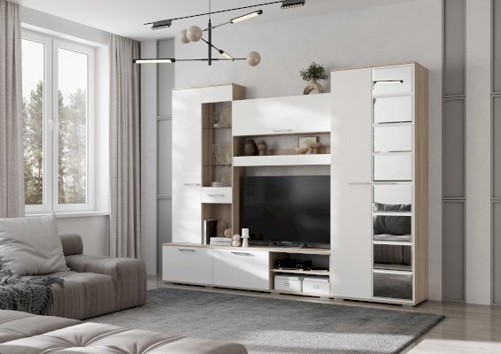 Гостиная Флай идеально подчеркнет сдержанный интерьер, при этом добавит лоска за счёт фасадов из матового ЛДСП белого цвета. В данной модели вы сможете разместить не только телевизор, но и различные мелочи, документы, сувениры или книги. Нестандартное расположение открытых полок придает гостиной Флай невесомости и делает ее очень стильной.