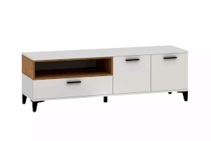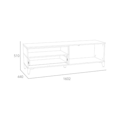 Тумба оснащена полками за распашными дверками и ящиком, который выдвигается плавно и бесшумно благодаря шариковым направляющим. Открытая ниша может быть собрана как на правую, так и на левую стороны, и в ней можно удобно расположить книги или элементы декора, а высокие опоры придают внешнюю легкость и обеспечивают быстрый и легкий доступ во время уборки.