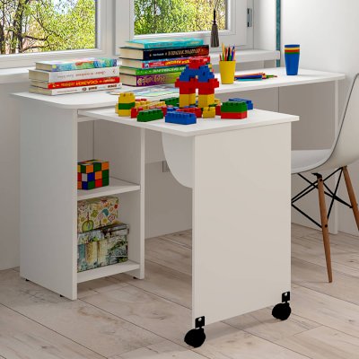 Очень практичная модель стола ПС-03 подойдет как для детской комнаты, так и для кабинета или офиса. Особенностью стола является раздвижная столешница, которая создает дополнительную рабочую поверхность. В двух открытых нишах можно хранить необходимые предметы или канцелярию. Белый цвет изделия позволит ему расположиться в любом интерьере.