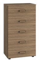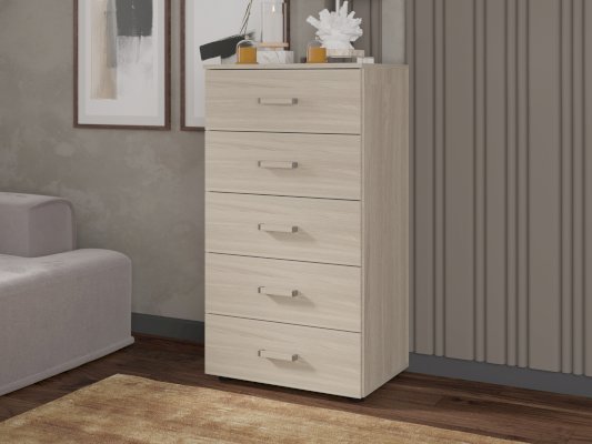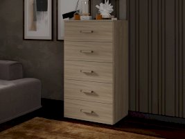Высокий узкий комод оборудован пятью широкими выдвижными ящиками для белья и личных вещей. В небольшой комнате будет незаменим для организации хранения вещей.