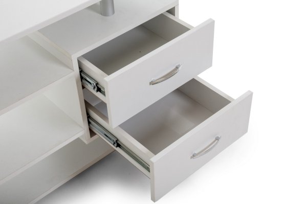 Удобная телевизионная тумба с открытыми полками для аудио/видео-аппаратуры, закрытыми полками и вместительным выдвижным ящиком.