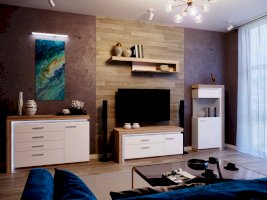 - Коллекция представлена в следующем цветовом решении: Корпус ЛДСП 16 мм  в декоре «Дуб Сакраменто» и фасад МДФ 16 мм в декоре «Белый снег глянец»