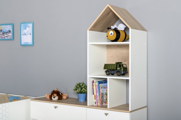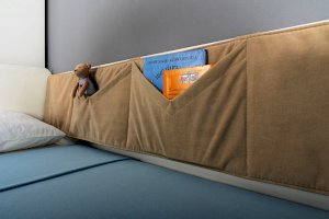 Кровать оснащена съёмным мягким элементом с карманами, передвижным бортиком и декорирована оригинальным рисунком - мультяшными пчёлками, которые никого не оставят равнодушным.