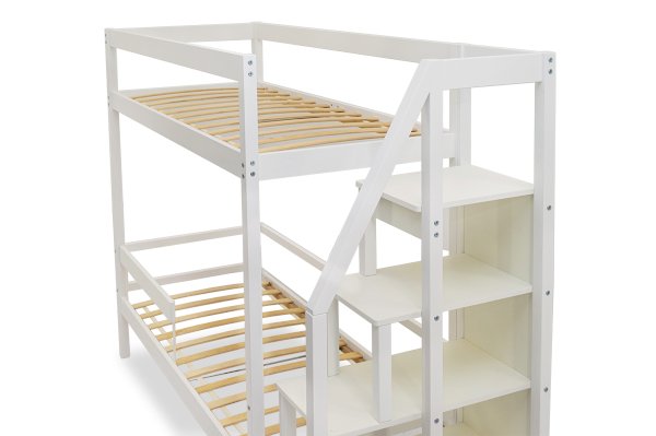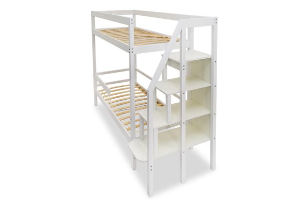 Кровать оборудована практичной лестницей-стеллажом. Полки лестницы можно использовать для игрушек, книг, ночника. Лестницу легко зафиксировать как справа, так и слева от кровати, что очень удобно. На каждом ярусе установлено прочное ортопедическое основание из 12 лат. Спальное место выдерживает нагрузку до 200 кг.