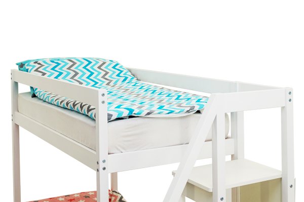 Благодаря своей конструкции, при которой оптимальна высота между ярусами и ширина спальных мест, кровать комфортна и удобна для сна и игр. Лестница и ящики под кроватью – это отличные места для хранения любых вещей.