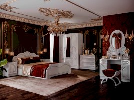 Спальня для респектабельного интерьера. Фасады с простым резным рисунком, кровать с красивым изголовьем. Дизайн спальни направлен на создание спокойной атмосферы для отдыха и сна. В составе гарнитура - комод с зеркалом в спальню.