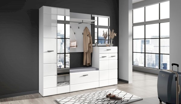 Компактная и функциональная вешалка из белого ЛДСП включает в себя самое необходимое для организации хранения в прихожей. Верхняя полка разместит головные уборы, а металлическая штанга и пять крепких крючков контрастного черного цвета поместят на себе одежду объемом с небольшой шкаф. Идеально компонуется со всеми модулями системы Йорк.