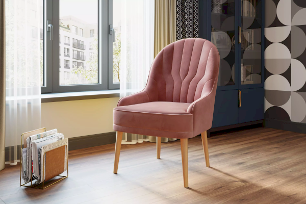 Кресло имеет оптимальную по высоте спинку, чтобы не причинять неудобств, если душевные посиделки с друзьями затянулись. Высокие ножки имеют изящный изгиб и выполнены из дерева, а каркас из березовой фанеры. Сиденье состоит из ППУ и мебельного ремня, что создаст комфортное размещение.