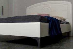 Кровать установлена на высокие ножки, что делает конструкцию лёгкой и воздушной, изголовье кровати декорировано фрезеровкой. Матрас укладывается на ортопедическое основание с гнутоклееными ламелями.