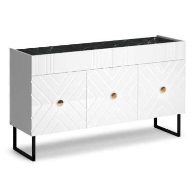 Благодаря наличию двух исполнений, вы с легкостью подберете подходящий именно вам вариант. Темное решение представлено в ЛДСП черного цвета с глянцевыми фрезерованными фасадами черного цвета. Светлый комод выполнен из белого ЛДСП с белыми глянцевыми фасадами. Столешница в обоих исполнениях производится из ЛДСП Креатель с рисунком - имитацией натурального мрамора, благодаря чему мебель выглядит особо эффектно. Небольшие ручки в цвете золото придают мебели завершенный вид.