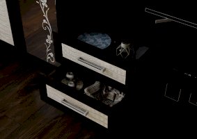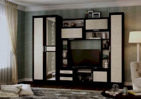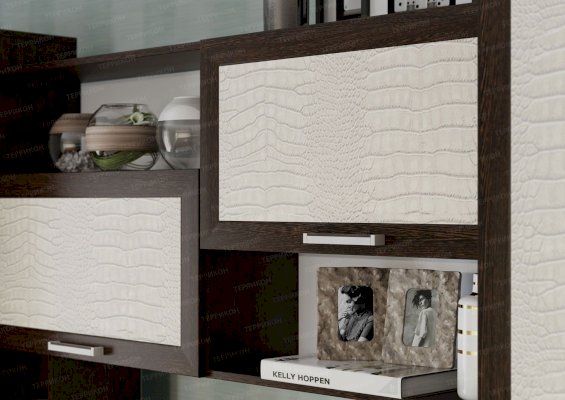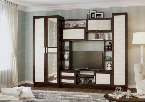 Двухцветная гостиная «Флора-2» привлекает своей простотой и универсальностью. Беспроигрышная комбинация натуральных оттенков подходит абсолютно к любому цветовому оформлению интерьера. Изящный растительный орнамент на зеркале, несимметричность конструкции, а также поверхности фасадов с фактурой под крокодиловую кожу делают комплект стильным и уникальным.