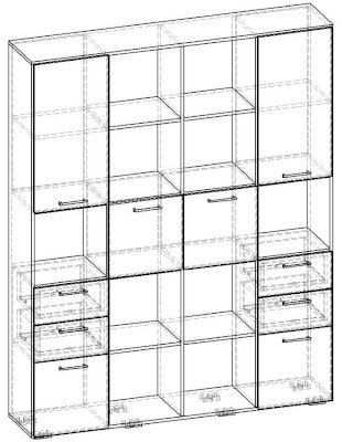 Применение задней стенки из ЛДСП (в ячейках с ящиками и фасадами) позволяет использовать данный стеллаж для зонирования пространства (чтобы предотвратить опрокидывание, необходимо обеспечить крепление стеллажа к стене).
